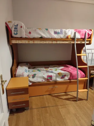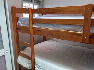 Conjunto de literas de madera con colchones incluidos. Perfectas para optimizar el espacio en habitaciones infantiles o de invitados. - Estructura de madera resistente. - Colchones cómodos y limpios. - Diseño clásico y funcional.