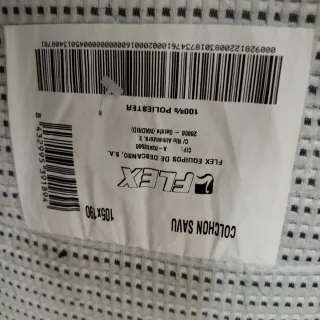 Colchón de la marca Flex, modelo Savu, con medidas de 105x190 cm. - Composición 100% poliéster. - Fabricado por Flex Equipos de Descanso, S.A. - Dirección: C/ Río Almanzora, 2, 28906 Getafe (MADRID).