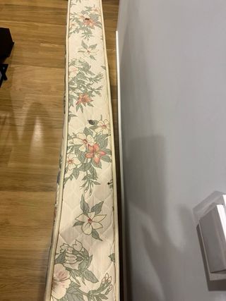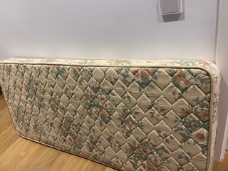 Colchón individual de 90 cm, ideal para una cama individual o para invitados. Es de tela, con un diseño floral discreto en tonos beige y gris. Se encuentra en buen estado. - Medidas: 90 cm - Material: Tela - Diseño floral