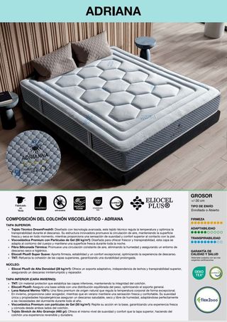 Vendo colchón Adriana, prácticamente nuevo. Es viscoelástico, de 30cm de alto y ofrece una sensación de suavidad y confort inigualables. - Tejido DreamFresh®: regula la temperatura y optimiza la frescura. - Núcleo de alta densidad (28 kg/m³): soporte adaptativo, independencia de lechos y transpirabilidad. - Lana natural Merino 100%: - Viscoelástica Premium con partículas de Gel (50 gr/m²): suavidad y confort.