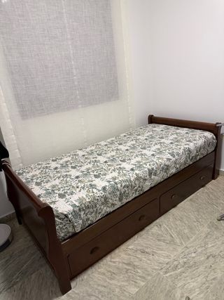 Cama individual con un diseño moderno y funcional. - Estructura de color blanco. - Incluye dos cajones de almacenamiento integrados. -Cabezero de madera Colchón viscolastico de 90 con alguna mancha significativa del uso -Sirve para cama articuladas de 90 -Se adapta al cuerpo -Funcional anti escaras El precio total incluye somier, cajoneras y colchón, ya que, en su compra, se vende por separado. Precio negociable.