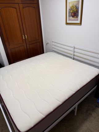 Se vende estructura de cama con somier y colchón. - Estructura de cama blanca. - Somier de láminas de madera. - Colchón incluido.