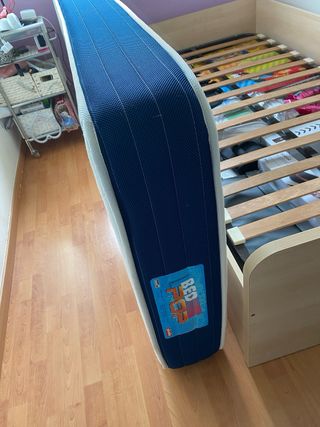 Cama pequeña con estructura resistente. - Base de cama azul. - Colchón con funda multicolor.