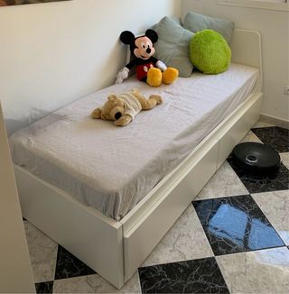 Cama nido blanca ikea. Incluye los 2 colchones. La cama está desmontada. En la segunda foto NO aparecen todas las partes. - Estructura reforzada (2ª foto). - Colchones practicamente nuevos, con funda. Muy poco uso por estar en el cuarto de invitados. - Somier de lamas.