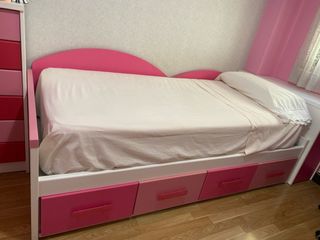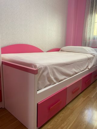 Cama individual con un diseño moderno y práctico, ideal para optimizar el espacio. Incluye colchón comprado recientemente, prácticamente a estrenar. - Estructura de madera. - Cajones de almacenamiento integrados. - Combinación de colores rosa y blanco