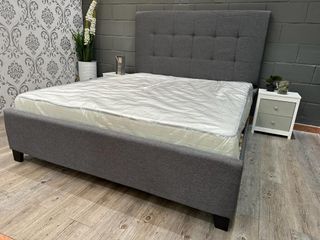 Cama matrimonial con cabecero. - Estructura de tela gris. - Cabecero con diseño capitoné. - Incluye colchón.