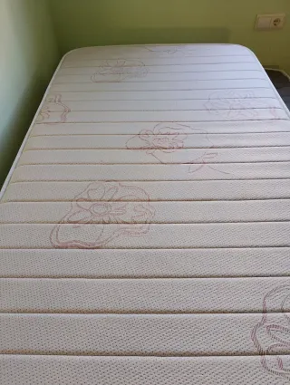 Colchón para cama individual de 90 cm, en excelente estado y con muy poco uso. Presenta un diseño con motivos florales en tono rosado. - Tejido exterior de alta calidad. - Diseño floral discreto. - Medidas: 90 cm de ancho.