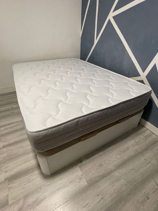 Se vende pack completo de cama con canapé, colchón y cabecero. - Canapé de gran capacidad. - Colchón con tejido acolchado. - Cabecero tapizado.