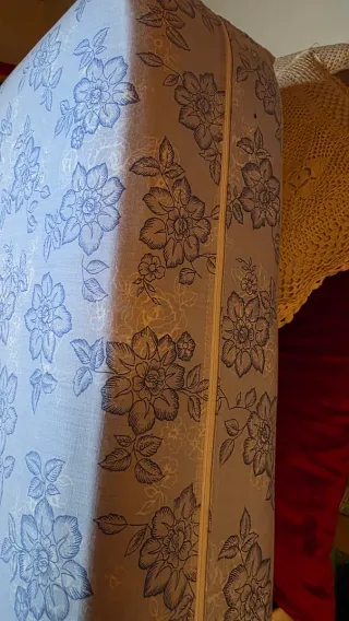 Colchón en buen estado con un bonito estampado floral. - Diseño de flores en tonos azules y blancos. - Tejido resistente y duradero.