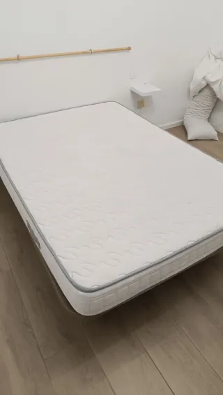 Colchón doble con la base de la cama. Está en buen estado, aunque el colchón tiene una mancha grande de pintura. El colchón además de muy cómodo tiene la parte transpirable para verano y Peludita de invierno (la manchada); - Incluye: 1 cama doble y 1 colchón. - El juego de sábanas no está incluido. - Medidas
