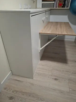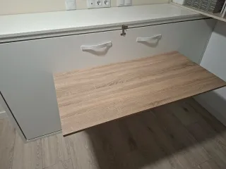 Mueble funcional que combina cama abatible y escritorio, buena calidad. - Medidas: 2.05 metros de largo, 1.08 metros de alto y 0.44 metros de profundidad. - Estructura de madera con soportes de metal. - Se puede desmontar la mesa escritorio abatible por separado y anclarla en la pared.