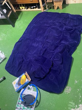 Cama hinchable Intex de color azul marino, en buen estado. Incluye inflador de pie y kit de reparación. Es perfecta para invitados o acampadas. - Colchón hinchable doble. - Inflador de pie. - Kit de reparación.