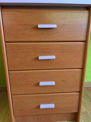 Se vende dormitorio de cama de matrimonio de 150 cm. - Cabecero de madera ( 30 euros) - Canapé nuevo de madera ( 300 euros) - 2 mesitas de noche de dos cajones, el superior de cristal opaco 45 cm ancho x 40 cm fondo x 42 cm alto ( 25 euros x 2= 50 euros) - 1 rinconera con hueco para guardar cosas de 53 x 53 cm ( 30 euros) - Cómoda baja de dos cajones, el primero con cristal opaco 100 cm largo x 40 cm fondo x 42 cm de alto ( 40 euros) - Cómoda alta de tres cajones, el superior con cristal opaco 100 cm de largo x 40 cm fondo x 55 cm alto ( 45 euros) Las cómodas se pueden apilar , no disponible colchón