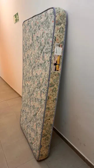Se vende colchón de 90x190 cm junto con un somier de lama ancha. El somier está fabricado con una estructura metálica y lamas de madera. - Colchón de tela con diseño floral. - Somier con lamas anchas.