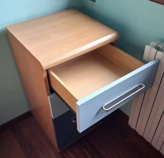 Cómoda de tres cajones con tiradores metálicos. Sirve también de mesita de noche o cajonera. Conglomerado madera clara con cajones azul claro y marino. Tiene ruedas. Bien conservada, con un par de desperfectos que se pueden ver en las fotos. MEDIDAS Ancho: 45cm Fondo: 44cm. Con los tiradores: 47cm. Alto: 73cm. Con las ruedas: 78cm. Alto cajón grande: 35cm. Alto cajones medianos: 17,5cm. Fondo cajones: 37cm. Largo tiradores: 24cm. Posibilidad de comprar el dormitorio juvenil completo con estantería de pared y cama doble nido con o sin colchones (ver publicaciones del perfil).