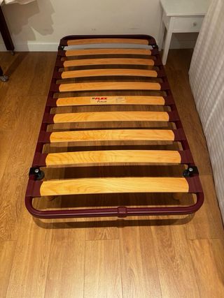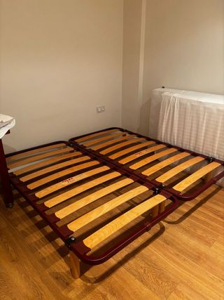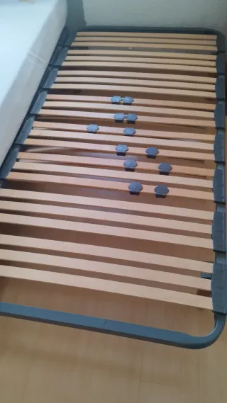 Se vende somier de láminas de madera en buen estado, con medidas de 1,35 metros de ancho por 1,90 metros de largo. Se incluye un colchón. - Estructura de metal. - Láminas de madera.