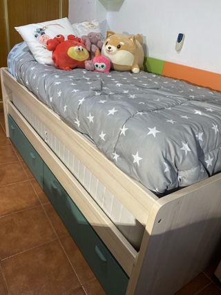 Cama individual de 90 cm con cama nido y cajones. Está en buen estado y es perfecta para una habitación infantil o juvenil. - Incluye cama nido y varias cajoneras para almacenamiento. - Estructura de madera y detalles metálicos. - Preguntar por colchon y almohadas