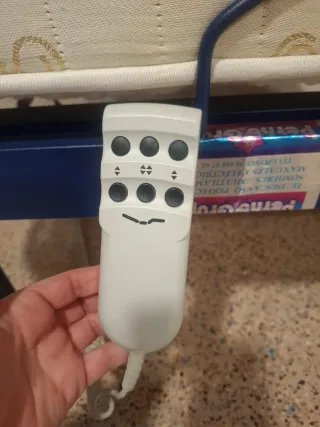 Cama articulada con colchón. - Estructura de metal y plástico. - Colchón de color beige con texto. - Mando para ajustar la posición. Cama de 90