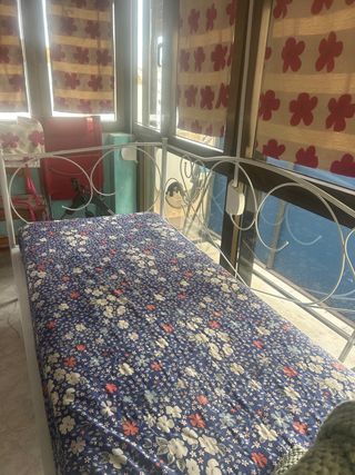 Se vende diván con colchón. - Estructura de metal. - Colchón con estampado floral azul y blanco.