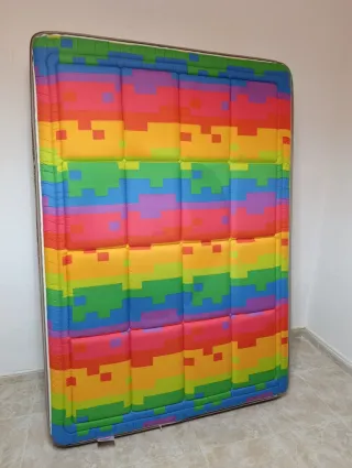 Colchón con un llamativo diseño de arcoíris pixelado. El lateral del colchón tiene una cinta con texto. - Diseño de arcoíris. - Cinta lateral con texto.