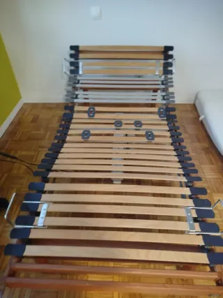 Base de cama articulada con motor. - Estructura de madera con láminas. - Mecanismo de elevación motorizado. - Soportes metálicos para el colchón.