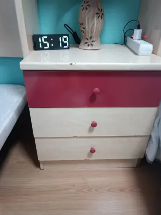 Cama nido de 90 cm con un diseño moderno y funcional. Tiene la estructura de abajo con somier y colchón extraible. La cubierta esta rota. - Estructura principal de madera. - Cajones frontales en color verde. - Tiradores de madera para los cajones. A recoger en Tomelloso, parque de la antigua estación de tren. No negocio precio.