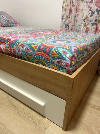 Se vende cama individual de 90 incluyendo el somier y el colchón. Tiene muy poco uso, está como nueva. - Estructura de madera. - Incluye somier y colchón. - Diseño moderno con cajones de almacenaje. Los cajones son reversibles, pueden ponerse en el lado derecho o izquierdo. Las medidas de la cama son 197 de largo, 97 de fondo y 77 de alto con el cabecero. Las medidas de los cajones son de 95,7 de largo x 50 de fondo. Cualquier duda no dudéis en contactarme.