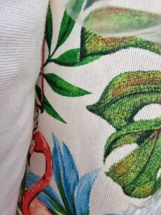 1 sofá hecho con palets, ideal para exteriores. Incluye cojines decorativos. - Palets pintados en blanco + tratamiento anti humedad ( se encuentra desmontado pero se entrega toda la tornillería) - Cojines con estampado de hojas tropicales. ( Sin usar y con el embalaje original) - Tamaño : Palet Europeo doble altura ( 120x80) son 2 palets de asiento en altura + 1 de respaldo. - Se entrega con funda protectora de rafia