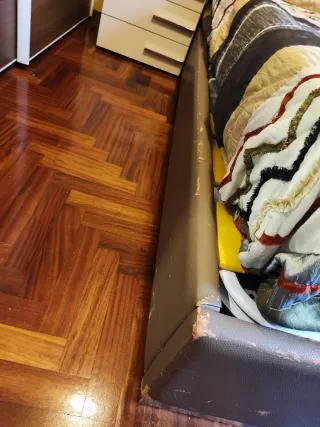 Se vende conjunto de canapé abatible, colchón y cabecero. - Estructura del canapé en madera. - Tapizado polipiel( esta un poco cuarteado) - Cabecero con diseño moderno. - Colchón incluido.