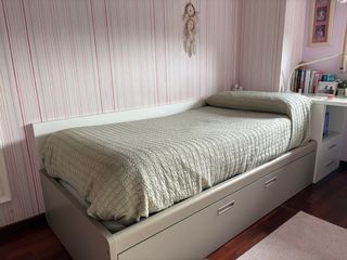 Estructura de cama modelo BRIMNES de IKEA, en color blanco. - Tamaño 80x200 cm. Tirando del somier se transforma en una cama doble de 160 cm. - Se transforma en un sofá con unos cuantos cojines. - Perfecta para habitación pequeña. - Incluye dos colchones. Los cajones son grandes para poder guardar edredones, ropa de cama... La estructura tiene algun pequeño desperfecto que se ve en las fotos. Colchones: Colchones viscoelástica memo fresh - núcleo blue latex - tejido aloe touch. Hecho en España. Grosor 15 cm. *Desmontaje y transporte a cargo del comprador. Precio nuevo estructura 249€ y colchones 99€. Total 447€.