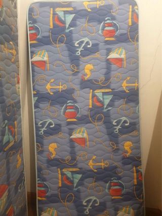 Colchón juvenil con un diseño de rayas azules sobre fondo claro. Es cómodo y se adapta bien y con poco uso. - Diseño de rayas azules y blancas. - Acolchado suave.
