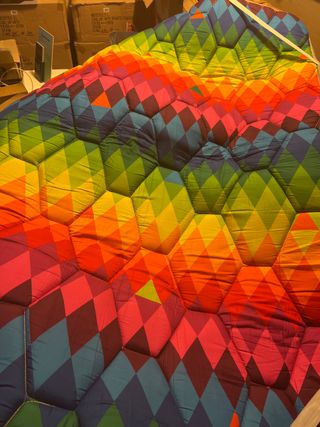 Topper para cama de 1,35x1,90 metros con un diseño vibrante y llamativo. - Diseño hexagonal en forma de rombos. - Colores vivos que crean un efecto arcoíris. Articulo de tienda de exposicion esta nuevo solo que estaba expuesto Se vende por cierre