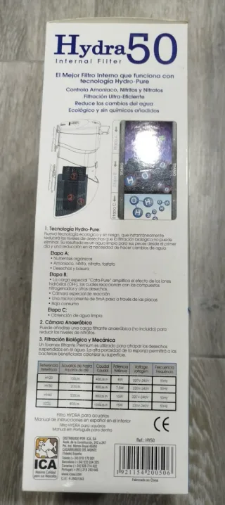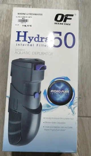 Filtro interno para acuarios marinos y de agua dulce, modelo Hydra 50 de Ocean Free. Diseñado para hasta 800L. - Tecnología Hydro-Pure. - Especializado en depuración acuática. - Ayuda a desintoxicar amoníaco y nitritos. - Promueve una depuración de agua efectiva. - Contribuye a mantener un agua pura y estable.