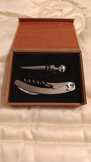 Set de accesorios para vino presentado en una caja. - Sacacorchos de metal. - Tapón para botellas de metal. - Caja de madera.
