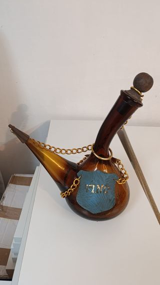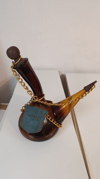 Bonito botijo decorativo con forma de cuerno, ideal para coleccionistas o como pieza de exhibición. - Fabricado en cristal con detalles en dorado. - Incluye una etiqueta de cuero con la palabra VINO. - Cadena dorada decorativa.