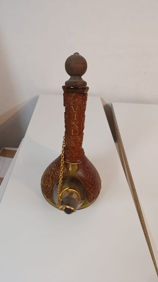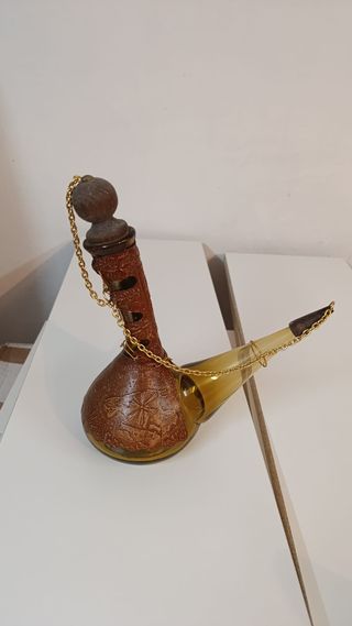 Bonito botijo de cristal con una funda decorada. - Funda de cuero con grabados. - Cadena dorada para colgar. - Tapón de madera.