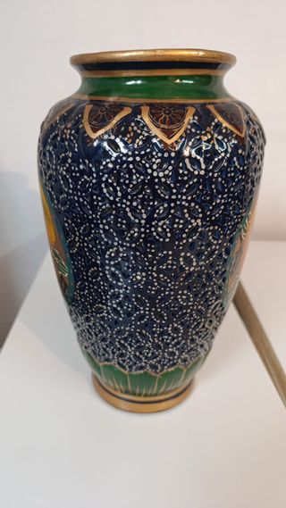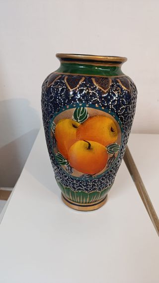 Elegante jarrón de porcelana con un diseño artístico. - Detalle de frutas pintadas en tonos naranjas. - Acabado con detalles dorados y motivos vegetales. - Borde superior en verde y dorado.