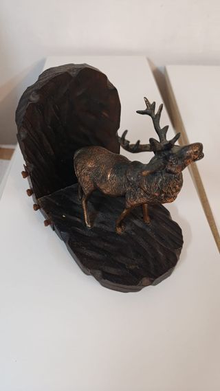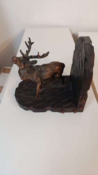 Bonito sujetalibros con figura de ciervo. Un detalle decorativo para tu hogar. - Diseño de ciervo con astas. - Base y soporte de madera tallada. - Acabado en tono bronce.