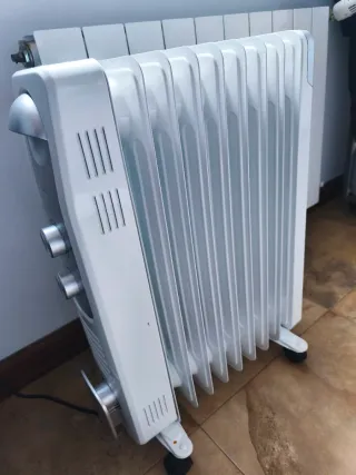 Estufa de aceite Equation en color blanco. Cuenta con dos ruedas para facilitar su movilidad. - Panel de control con dos diales. - Diseño de aletas para la distribución del calor. - Asa superior para transporte. - 2000W - Usada dos días nada más.