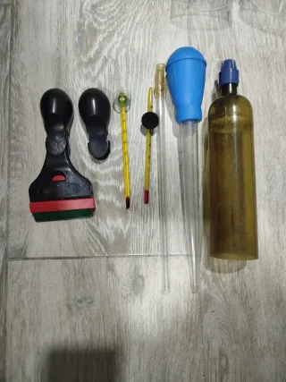 Lote de accesorios para acuario. - Termómetro de cristal marca GRILL, modelo CP7. - Densímetro de cristal marca BLAU aquaristic. -Densimetro fluvial sea - Alarma de nivel de agua marca BOYU 2 3 soportes para calcetín + un calcetin