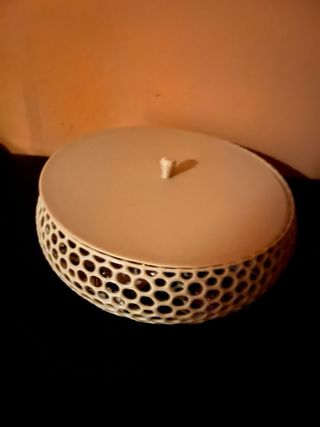 Cuenco decorativo con un diseño de panal y tapa. - Materiales: vidrio y plástico. - Color: beige y blanco.