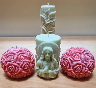 Conjunto de velas artesanales con un diseño único. - Vela central con relieve de flor. - Dos velas esféricas decoradas con rosas. - Colores: rosa y morado.