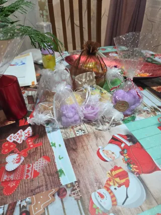 Conjunto de velas aromáticas decorativas, perfectas para ambientar cualquier espacio. - Velas de diferentes colores, incluyendo morado y amarillo. - Presentadas en bolsitas de tela y plástico.
