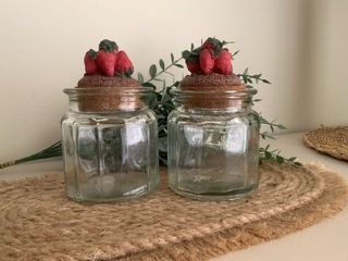 Set de dos tarros de cristal con tapa de corcho y adorno de fresas. - Diseño decorativo con fresas rojas. - Tapa de corcho. - Cuerpo de cristal transparente.