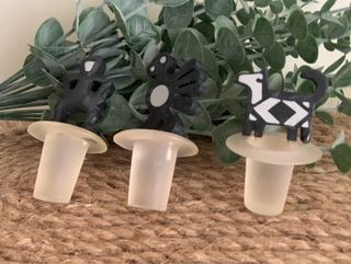 Set de tres tapones para botellas de vino con diseños únicos. - Figuras decorativas en la parte superior. - Base de goma para un sellado hermético.