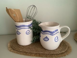 Conjunto de jarra y bote de cerámica para cocina, con un diseño pintado a mano. - Jarra con asa. - Bote para utensilios. - Diseño de ondas y motivos vegetales en azul.