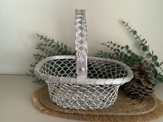 Cesta decorativa con un diseño elegante y un asa trenzada. - Fabricada en metal plateado. - Asa con detalle trenzado.