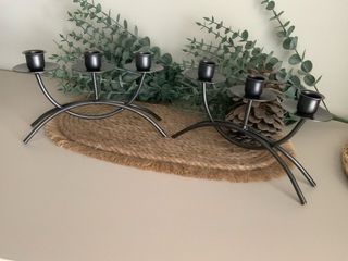 Dos candelabro de forja con capacidad para tres velas. Su diseño curvo y acabado en negro le dan un toque moderno y sofisticado. - Base de metal. - Soporte para 3 velas cada uno