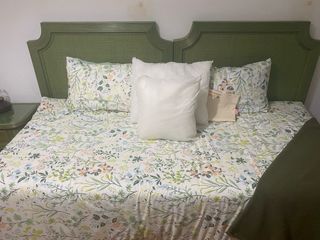 Conjunto de muebles de habitación en color verde como nuevos. - 2 Cabecero de cama. - Mesita de noche con cajones. - Cómoda 5 cajones. - Espejo a juego. - 2 funda nordica estampado floral. - 2 fundas de cojin estampado floral. Somier y colchon no incluidos.