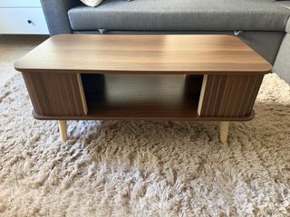 Elegante mesa de centro con un diseño moderno y funcional, perfecta para cualquier sala de estar. - Acabado en madera con detalles acanalados. - Patas de madera que le dan un toque ligero. - Espacio de almacenamiento abierto.